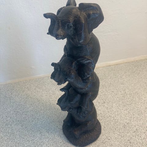 Sæt med 3 elefantfigurer udskåret i mørkt træ fra Afrika. Figurerne forestiller elefanter i forskellige stillinger med løftet snabel. De egner sig som dekoration på hylde, reol eller vindueskarm og kan bruges samlet som sæt eller hver for sig. Velegnet til indretning i stue, kontor eller andre rum, hvor man ønsker små træfigurer som pynt.