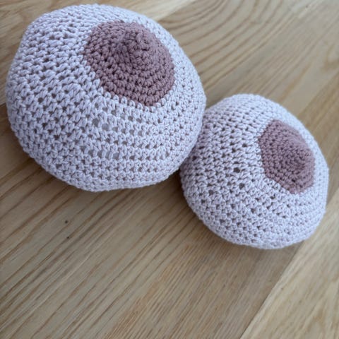 Hæklet dukke med brun hår og hvid/pink kjole
