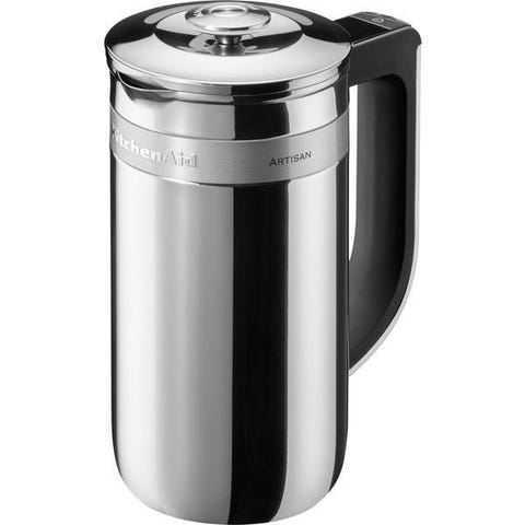 KitchenAid Artisan stempelkande i rustfrit stål med sort håndtag og låg. Kanden er beregnet til brygning af kaffe med stempelmetode. Konstruktionen i rustfrit stål hjælper med at holde kaffen varm og er nem at rengøre. Velegnet til brug i køkkenet til daglig kaffebrygning eller servering ved bordet.