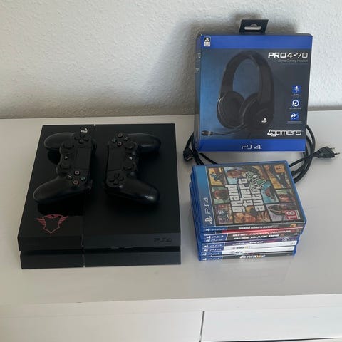 Sony PlayStation 4 konsol i sort. Konsollen er velegnet til gaming, streaming og afspilning af medier. Standard DualShock 4-controller medfølger ifølge billedet. Egnet til brug med PlayStation 4-spil og tilslutning til tv via HDMI.