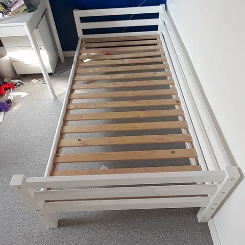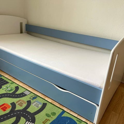 Juniorseng i hvidmalet træ. Sengen har tremmer på siderne og træelementer i naturfarve. Egnet som seng til mindre børn, passer til en 70*160 cm madras. Velegnet til brug i børneværelse. Der er et par klistermærker på, som ikke er forsøgt fjernet. Skuffe og madras er inkluderet i prisen.