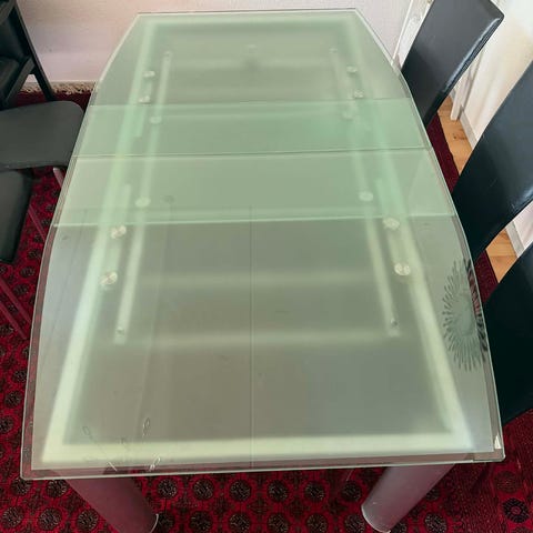 Spisebord i glas med stålben og 2 udtræksplader! Har brugsridser men ellers god stand