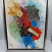 Abstrakt maleri på lærred i stærke, flerfarvede nuancer. Motivet består af dynamiske, organiske former og penselstrøg i blandt andet grøn, blå, gul, orange og hvid. Velegnet som vægdekoration i stue, kontor eller andre opholdsrum, hvor der ønskes et farverigt og moderne udtryk.