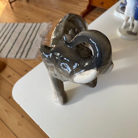 Elefant figur skulptur i mørk farve. Dekorativ stående figur med flere elefanter stablet oven på hinanden. Velegnet som pyntegenstand i stue, kontor eller på hylde. Materialet fremstår som mørkt, massivt kunstmateriale. Figuren står på en rund fod med filtpuder i bunden for stabil placering på bord eller reol.