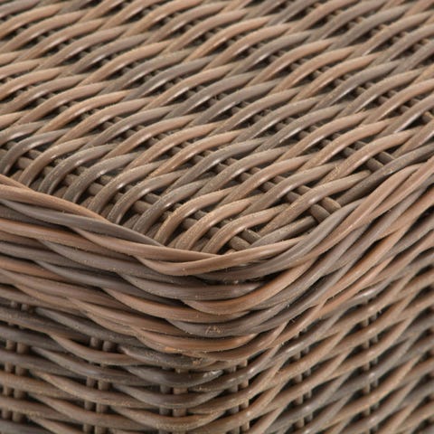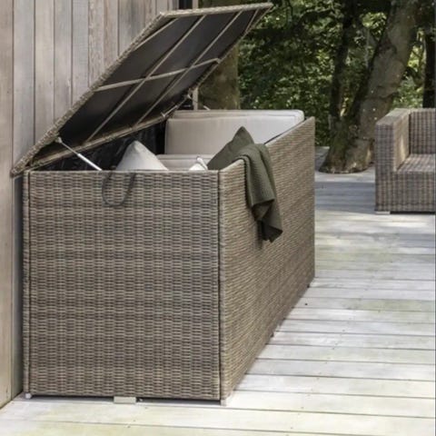 Hyndeboks i flet i beige nuance. Velegnet til opbevaring af hynder, tæpper eller andet udstyr på terrasse eller altan. Kassen har låg og er udført i flettet materiale, som giver et neutralt og diskret udtryk, der passer til mange udendørsmiljøer.