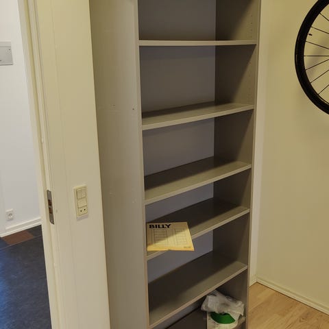 Billy reol fra ikea med tilhørende overreol, bagsiden er skåret lidt til for at passe til højt gulvpanel, men det ikke noget man rigtig ser