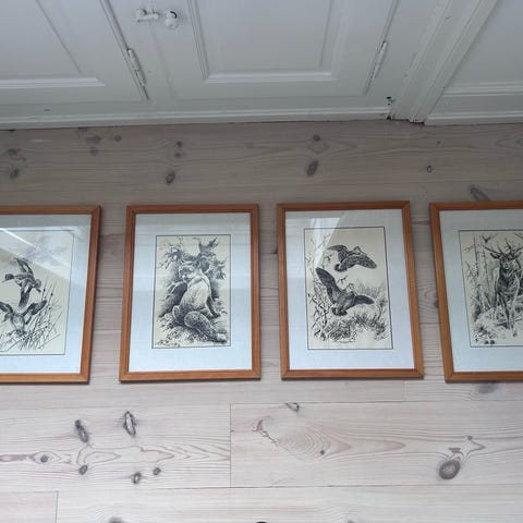 Mads Stage - Sæt bestående af 4 indrammede fugletegninger. Motiverne viser forskellige fugle i sort streg på lys baggrund. Hver tegning er monteret i en enkel, rektangulær ramme med glas. Velegnet til ophængning samlet som serie på væg, f.eks. i stue, gang eller kontor. Brand og præcis størrelse er ikke angivet.