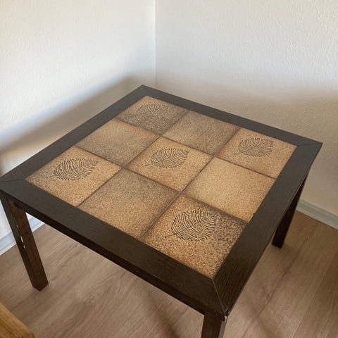 Lille kakkelbord med stel i mørkt træ, der er er behandlet med kalkhvid