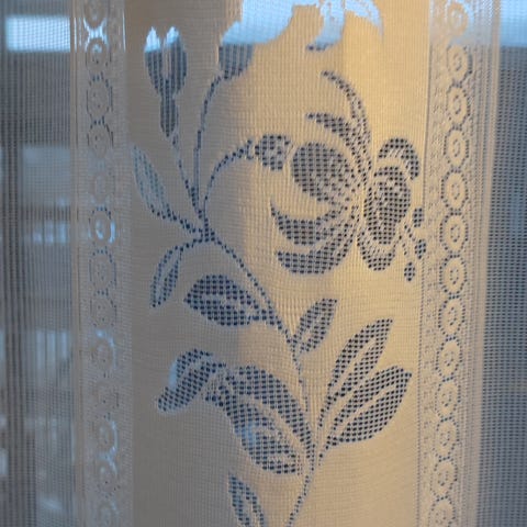 Gardin med blomstret blondekant i hvid. Gardinet er let gennemsigtigt og har broderet blomster- og bladmønster langs nederste kant med bølget afslutning. Velegnet som vinduesgardin eller som let afskærmning i stue, soveværelse eller andre opholdsrum.