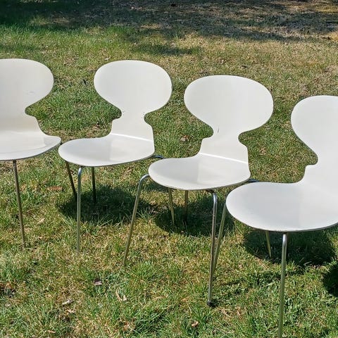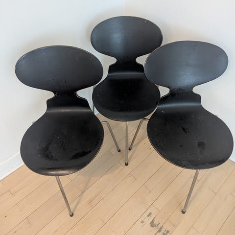 3 gamle stole fra AJ. De er bemalede og slidte i lakken. Den trebenet hat lidt blødhed i ryg. De to andre er ok.