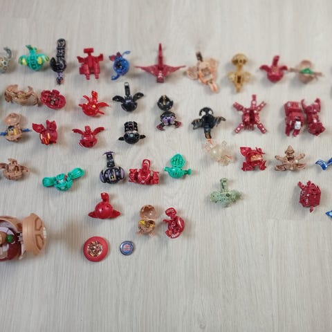 Bakugan figurer sæt med forskellige modeller i flere farver. Sættet består af små, sammenklappelige plastfigurer, der kan åbnes til forskellige dyre- og fantasiformer. Figurerne kan bruges til leg, samling eller som tilbehør til Bakugan spil og univers. 12 forskellige farver og designs er repræsenteret i sættet, som vist på billederne.