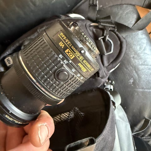 Nikon D3100 digitalt spejlreflekskamera. Kameraet ses med et standardzoom-objektiv monteret og et ekstra Nikon DX telezoom-objektiv samt Nikon MH-24 batterioplader. Kamerahuset har klassisk Nikon-betjening med programhjul på toppen, udløserknap ved grebet og hotshoe til ekstern blitz. Velegnet til generel fotoanvendelse som rejser, hverdag og hobbyfotografering, hvor der ønskes mulighed for udskiftelige objektiver og manuel styring af indstillinger.