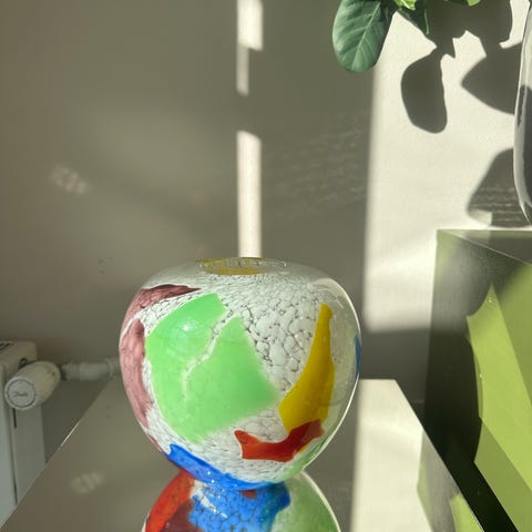 Dekorativ glasskulptur i Bordeaux glas med sølvfod. Måler 40 cm fra spids til spids, højde 40 cm. Perfekt til stor vindueskarm, entre eller på gulv.