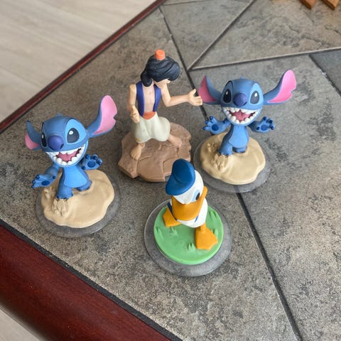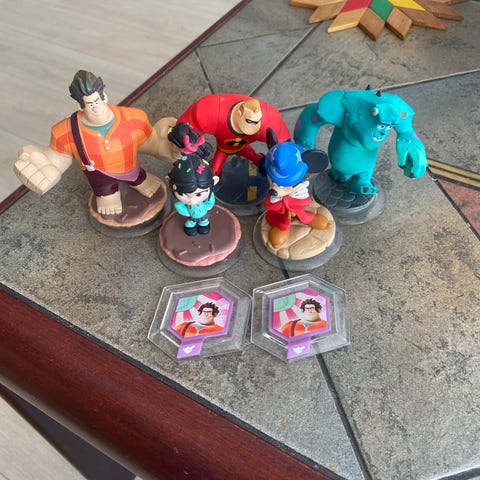 Disney Infinity 3.0 figurer sæt. Sættet indeholder flere forskellige Disney- og Pixar-figurer monteret på individuelle plastbaser, som kan bruges sammen med Disney Infinity 3.0 spil og kompatible konsoller. Figurerne er detaljerede samleobjekter i farvet plast, velegnede både til brug i spillet og som udstillingsfigurer. Egnet til børn over den aldersgrænse, der er angivet af producenten på emballage eller figurernes bund.