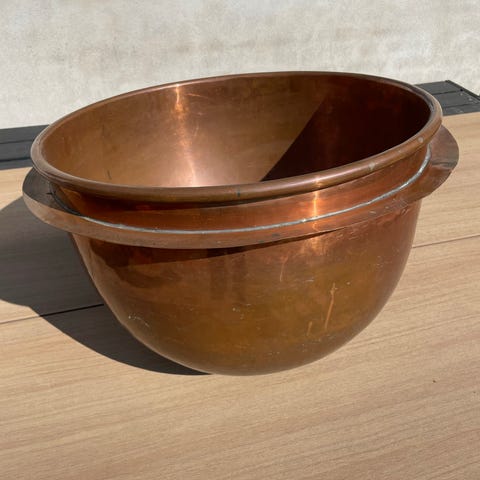 Stort flot vintage kobber kar med hanke sælges. Til brænde eller ser flot ud m beplantning.
