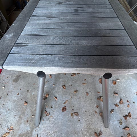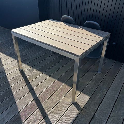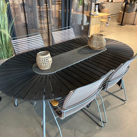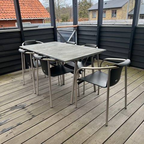 Sættet består af et rektangulært bord med lameller og tilhørende Ocean stole med armlæn. Møblerne har et let, stabelbart stel og lamelopbygget sæde og bordplade, velegnet til udendørs brug på terrasse,