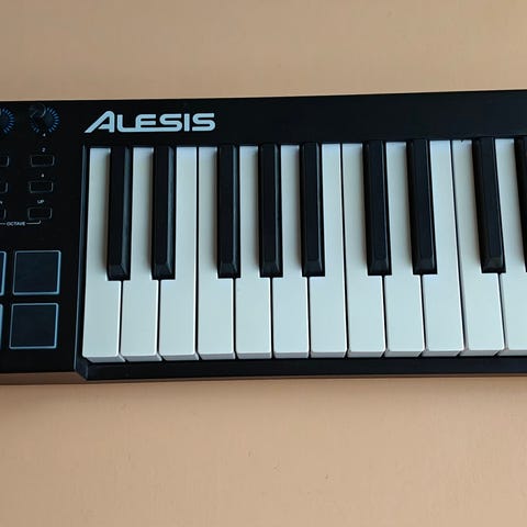 Samson Carbon 49 MIDI-keyboard i hvid. Keyboardet har pitch bend- og modulationshjul, transportknapper samt forskellige funktionsknapper til styring af software. Tilslutning via USB, MIDI out og indgang til sustainpedal.