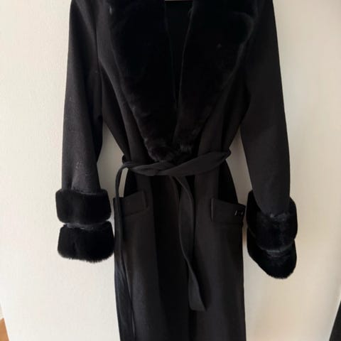 Hugo Boss frakke bestående af 100% lammeskind i sort. Den er størrelse 38 og har bindebælte i taljen.