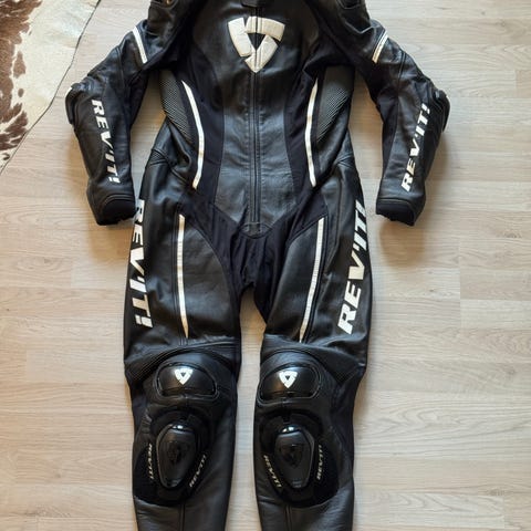Dragten er lavet i kraftigt kvalitetslæder og har indbyggede beskyttere ved skuldre, albuer og knæ. Jakke og bukser kan lynes sammen, så den fungerer som en samlet dragt – perfekt til både sportskørsel og banedage.