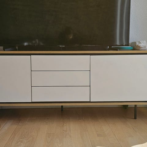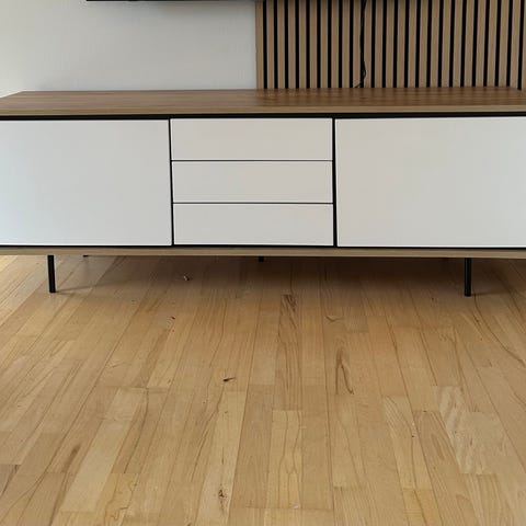 Rigtig fin skænk/tv-møbel fra jysk med sildebenslook. Tryk funktion på lågerne. Lågerne trænger til at bliver efterspændt/justeret. Fejler intet.