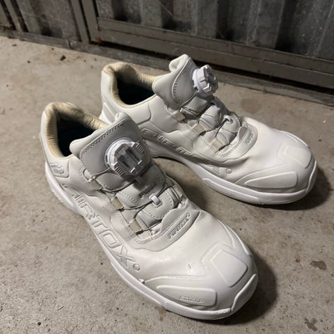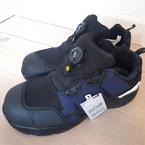 Sikkerhedssko/arbejdssko str. 42. De er lidt store i størrelsen, men se billeder af indersål. Passer formentlig str. 43 til 44. De er en smule nussede, men fejler ingenting. Bemærk det smarte system til snøring, det fungerer rigtig godt og er nemt at bruge.