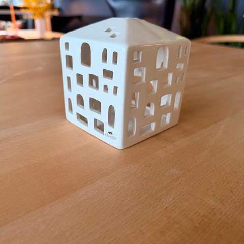 Stor model Kähler Urbania lyshus i hvid glaseret keramik. Lyshuset er udformet som en bygning med mange små vinduesåbninger, der lader lyset fra fyrfadslys skinne igennem. Egnet til indendørs brug som stemningslys og dekoration på fx vindueskarm, hylde eller bord. Designet af Bache og Bendix Becker for Kähler.