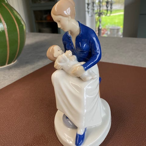 Grafenthal porcelænsfigur, der forestiller en familie med mor, far og barn. Figuren er udført i glaseret porcelæn i lyse farver med blå og beige nuancer. Motivet viser moderen siddende med barnet på skødet, mens faderen står ved siden af. Velegnet som dekoration i stue, vitrineskab eller samling af porcelænsfigurer.