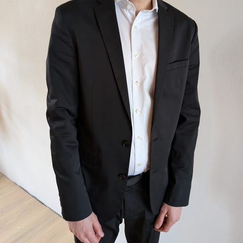 Med fire knapper ved ærmet og tre paspolerede inderlommer.