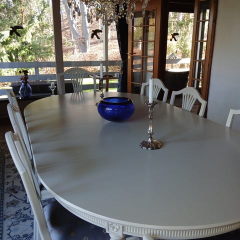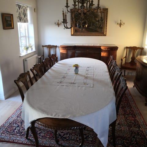 Spisestue i hvidmalet eg, med guldstafferinger i bladguld. Bord med 4 tillægsplader, skænk, skab, lille ovalt bord, 12 stole; 8 stole og 4 armstole. Stofsæderne er aftagelige.