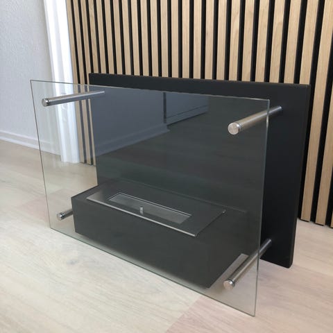 Fyld bio ethanol i pejsen, tænd op og nyd flammerne mellem glasruderne.