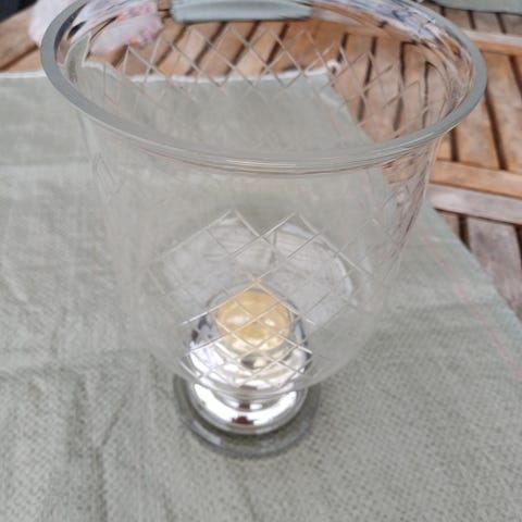 2 store og smukke lysestager/ hurricanes på sølvfarvet fod. Klart glas med fine slibninger.
