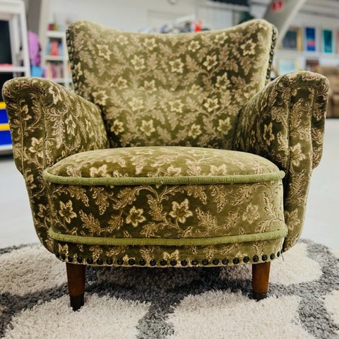 Lænestol overpolstret med blomstret velour, ben af bejdset træ.
