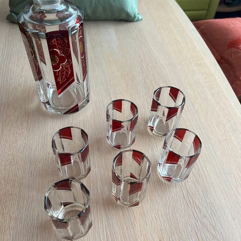 glas og karaffel sæt i klart glas. Sættet består af glas med facetslebet mønster samt karafler med tilhørende propper i samme mønster. Egnet til servering af fx vin, vand eller andre drikke ved borddækning og til opbevaring af drikkevarer i hjemmet.