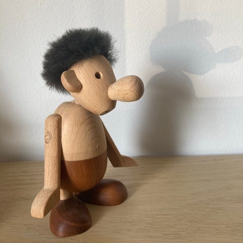 Teaktræs fuglefigur. Design Hans Bølling. Figuren er med kasket og øjne af plastik samt halstørklæde af læder og har en cigaret i munden . Højde 18 cm. Kan sendes.