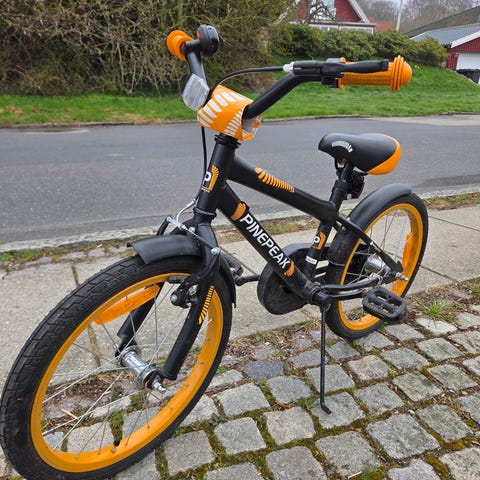 Pinepeak børnecykel med 18" hjul i sort/orange. Cyklen har lige styr, saddel med polstring og kædeskærm. Udstyret med fod- og håndbremse samt støtteben. Egnet til børn fra 4 til 7 år, der passer til 18" hjulstørrelse, til brug på hverdagsture og fritidscykling.