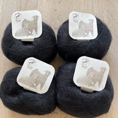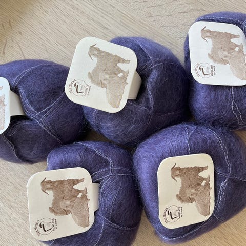 Der er 6 nøgler med banderole (150 g) og 3 fulde nøgler uden (75 g). I alt 225 g lækkert mohair garn.