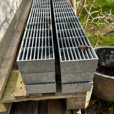 udført i rustfri stål med langsgående og tværgående ribber, der giver styrke og mulighed for afvanding. Velegnet til udendørs brug, f.eks. ved terrasser, indkørsler, kældertrapper eller andre områder.