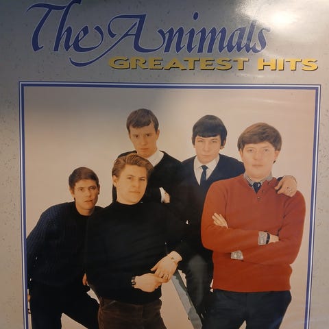 The Animals vinylplade. Cover med sort-hvidt foto af bandet og rød titeltekst på forsiden. Egnet til samlere af rock og beatmusik fra 1960’erne samt til afspilning på pladespiller.