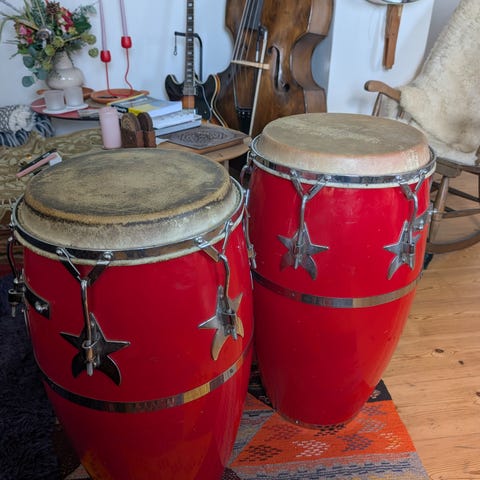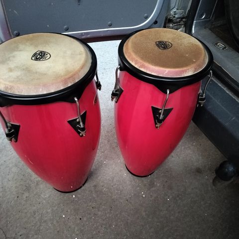 Sæt af 3 velholdte LP (Latin Percussion) Matador congas af træ - quinto, conga, tumba - flot rødlakeret, kun spillet på af Leopoldo F. Fleming (Nina Simones percussionist), når han har været i København at spille med egne ensembler, herunder sit Afro-Caribbean Jazz Ensemble, samt med andre, heriblandt Niels Jørgen Steens A-team, og indvendigt signeret af Leopoldo.