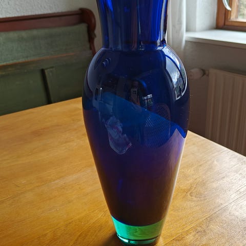 Fantastisk Holmegaard Harlekin Glasvase i blåt glas med tyk grøn bund.