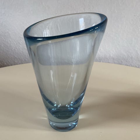 Glasvase i cylindrisk form i blå gennemfarvet glas. Vasen er høj og smal og egner sig til enkeltstående blomster eller mindre buketter. Designet er enkelt med glat overflade og lige kanter. Velegnet til placering i vindueskarm, på bord eller hylde som dekorativt element.
