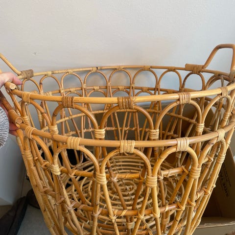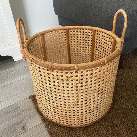 IKEA bamboo round basket, wooden natural-colored with an open pattern and two handles on the sides. Suitable for storing toys, pillows or blankets.