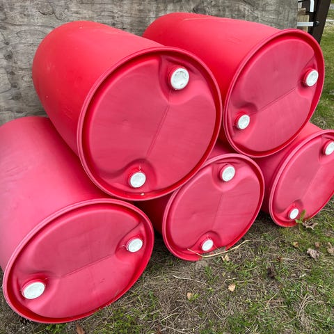 Blå metaltønder med en kapacitet på ca. 200 liter pr. tønde.