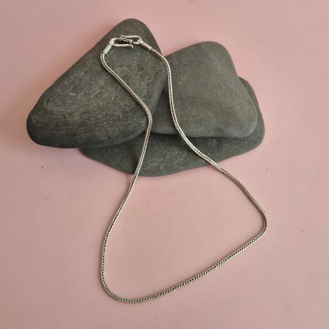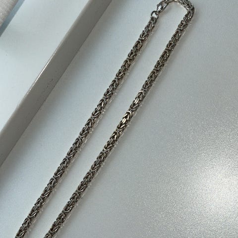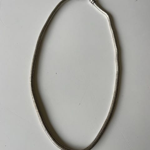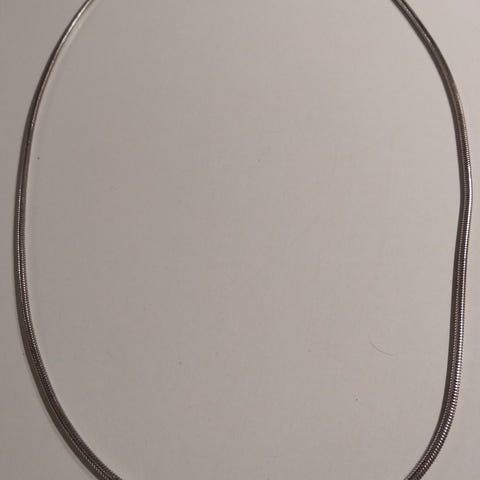 Flad slangehalskæde, der måler 36cm + 8cm forlængelseskæde. En gave, der ikke lige var mig. Den er som ny, da jeg kun har prøvet den på.