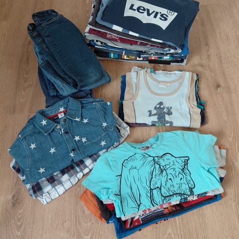 H&M,Molo,Puma,Jack&Jones mm drengetøj.Pakken består af blandet tøj til dreng, herunder T-shirts, shorts, lange bukser, trøjer og hættetrøjer samt enkelte accessories som huer og kasketter. Tøjet er egnet til hverdagsbrug og fritid for en dreng, Farver og motiver varierer, som det fremgår af billederne.