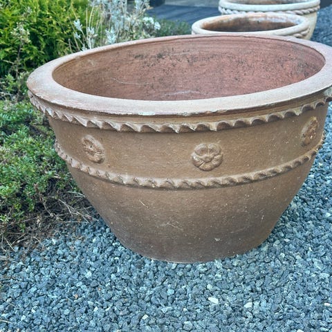 Stor terracotta krukke med klassisk, konisk form og markerede ringe på siden. Krukken er fremstillet i brændt ler i naturfarvet terracotta. Den har drænhul i bunden og egner sig til udendørs brug, f.eks. til større planter, buske eller små træer. Højden er ca. 40 cm, og diameteren i toppen er omkring 50 cm.