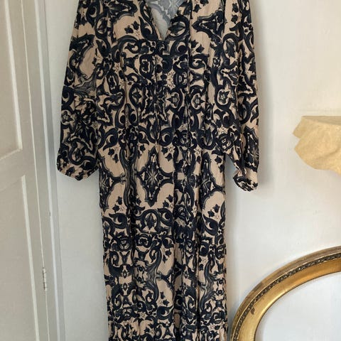 Kjole med skjorte krave og slids i siden + bånd i taljen. Farve sort med sand i blomstret mønster. Ærmer med vidde, ca 3/4 længde. Brugt 1 gang. Nypris 599