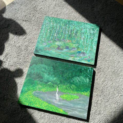 Sælger to unikke og farverige oliemalerier af den anerkendte danske kunstner Johannes Obel. Værkerne er malet i hans karakteristiske ekspressive og naivistiske stil med kraftige farver og markante penselstrøg.