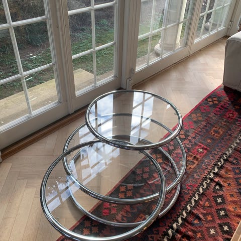 Super flot sofabord af messing(belagt) og røget glas. Jeg har ikke kunne finde den præcise model i de gamle kataloger, men det minder om Voss eller Dixie af Gillis Lundgren fra start 70erne. Det har fået en lille skade i det ene nedre hjørne, hvor noget rødvin har ætset lidt af belægningen. Man kan godt polere det væk, men det tager nok også lidt af den gyldne farve af, så vi ville ikke gå videre med det fordi vi vidste det snart skulle have nyt hjem, efter at have tjent familien godt i 50 år. Dette afspejles i prisen :)