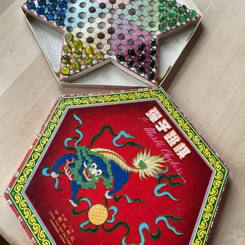 Brio Kinaseplet brætspil. Klassisk kinesisk dam-spil med trekantet spilleplade og farvede kugler/brikker. Spillet leveres i original æske med illustreret låg og integreret spilleplade i bunden. Egnet som familiespil eller som samlerobjekt for ældre brætspil. Komplet. Låget fremstår med slid og tape. Lidt farvenuancer på de blå og gule kugler